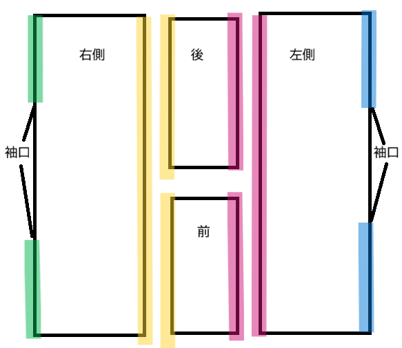 ■マーカー黄色とピンク同士をつないで前後の身頃にします