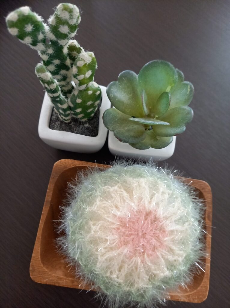 たわし用ヤーンならではの編みやすさと、仕上がりのふんわり感がちょうどよくて、つい「もうひとつ作りたい」と思ってしまうほどです。
