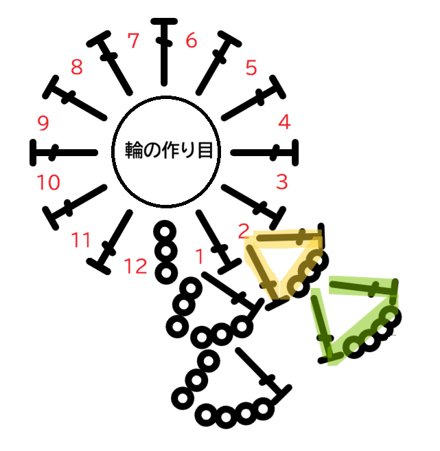 - 輪の作り目に鎖編み3目、長編み11目編み円にします
