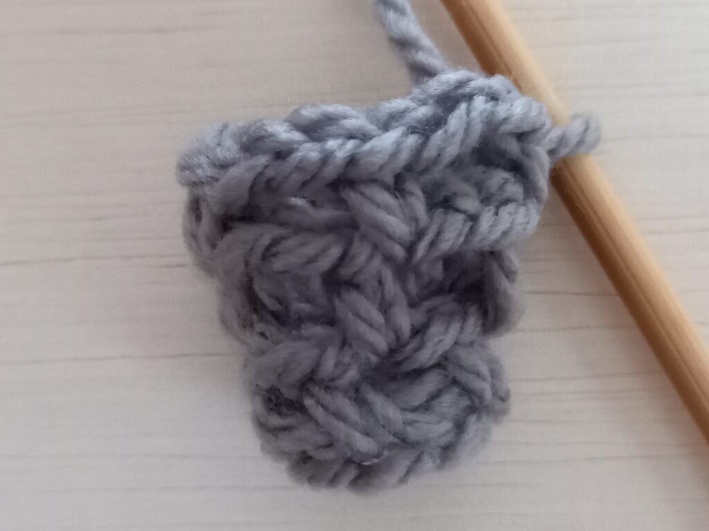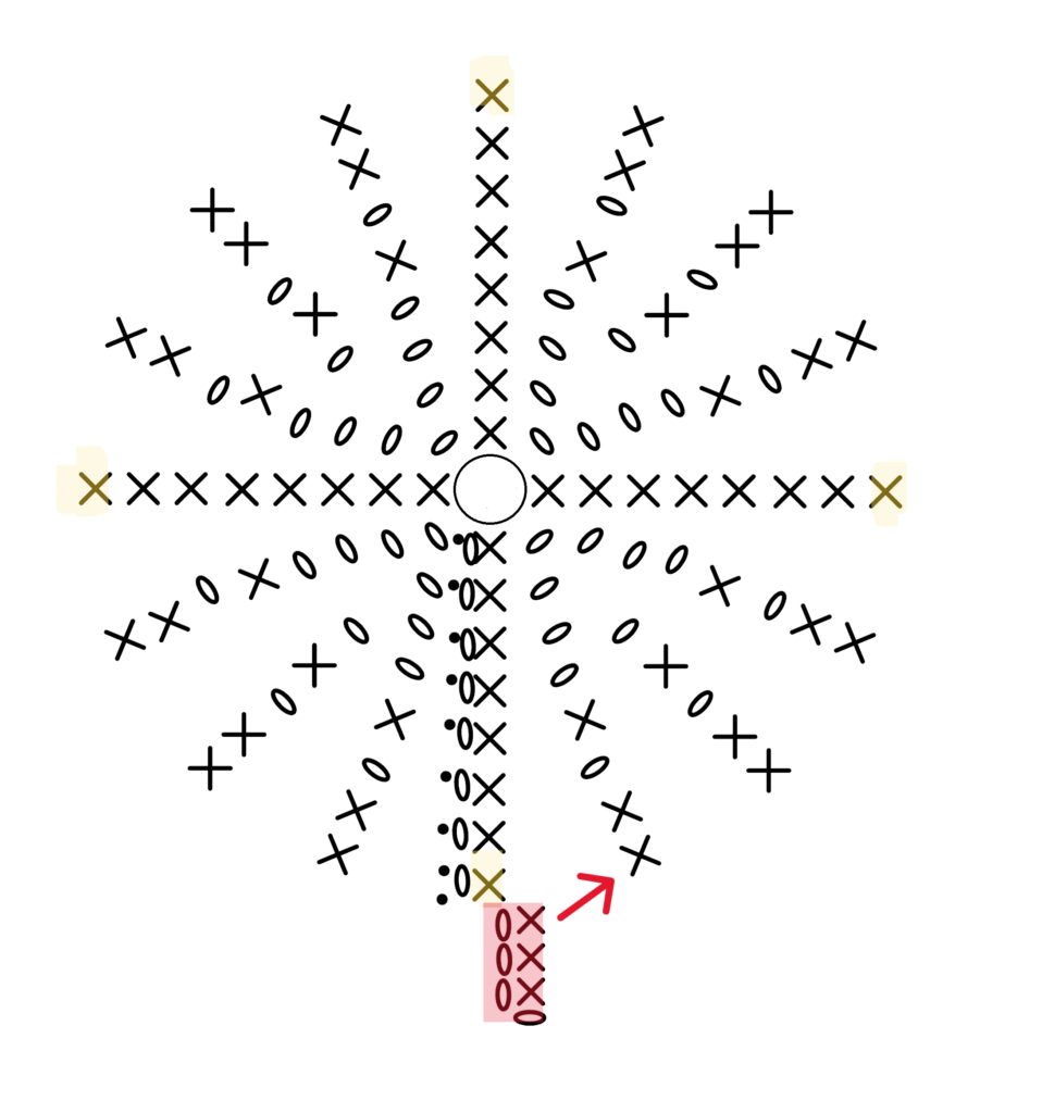 • {細編み1、赤印(鎖編み3、立ち上がり鎖編み1、細編み3)細編み3}×4
