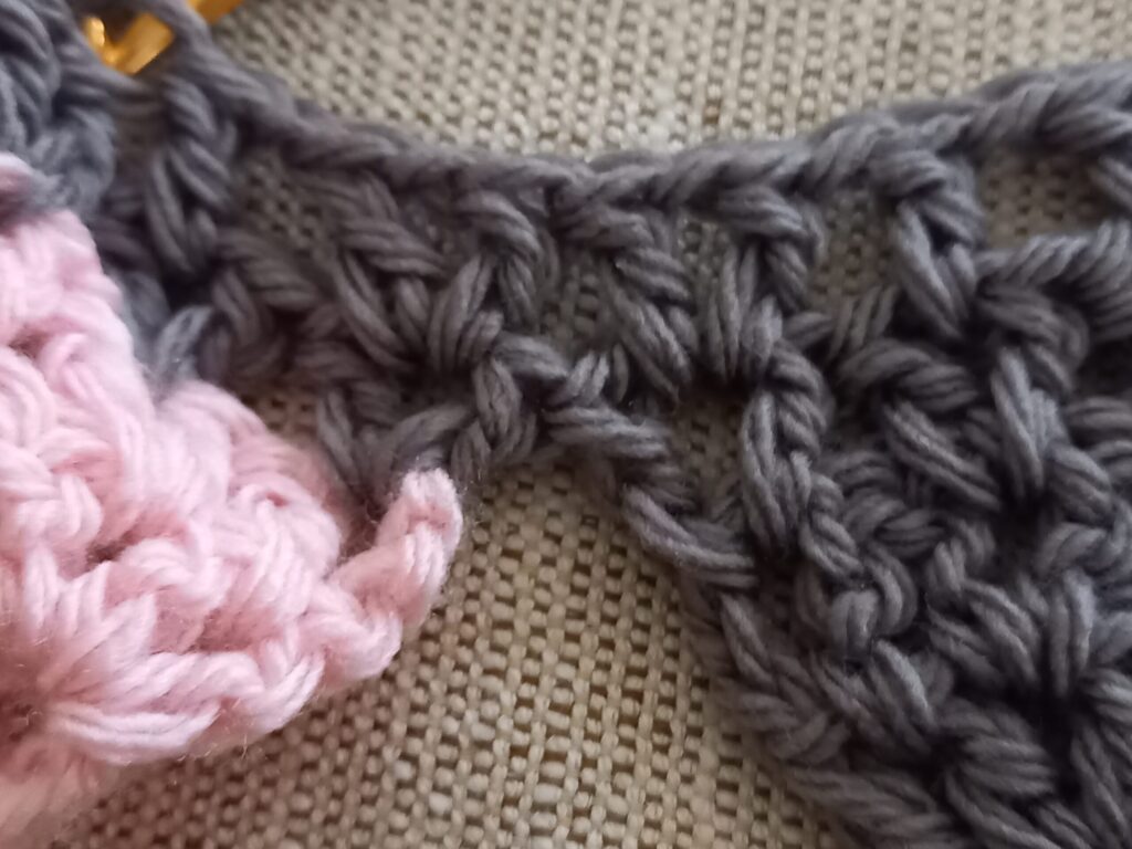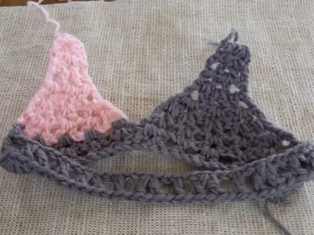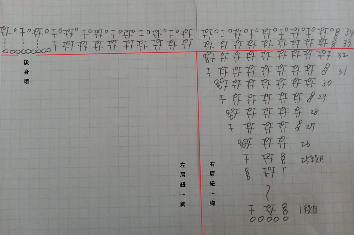 ②右肩紐~胸も同じように編み、33段目で左肩紐~胸をつなげます。