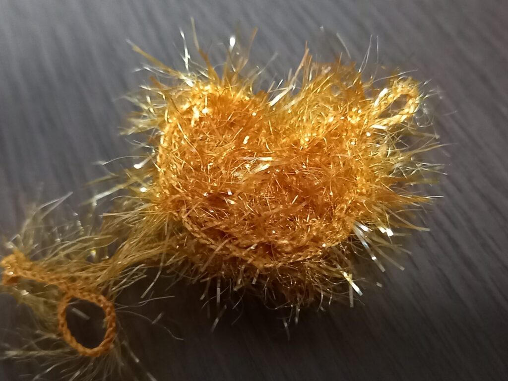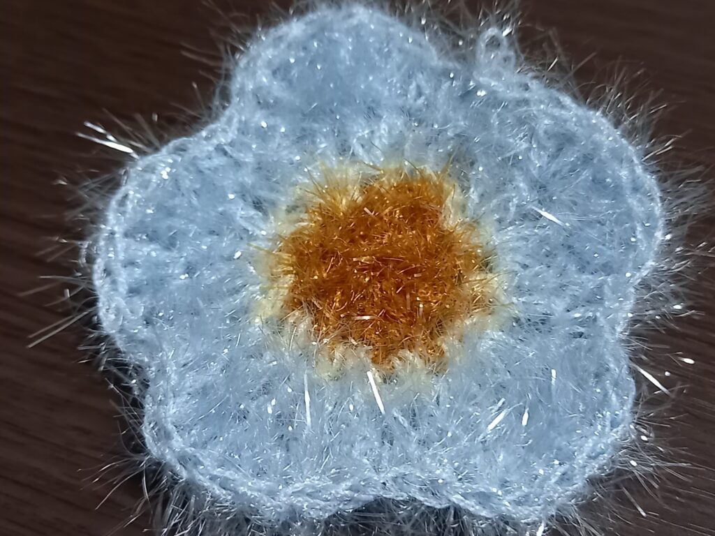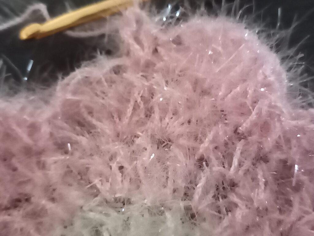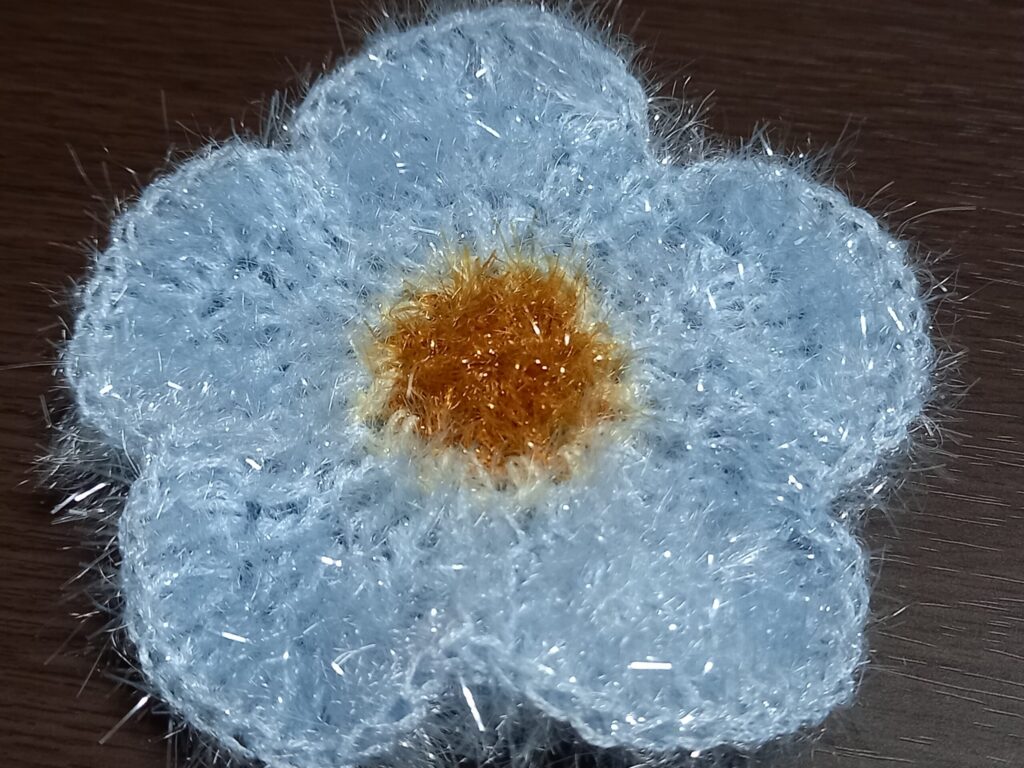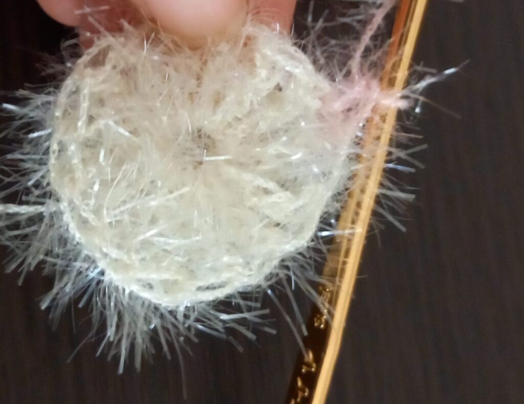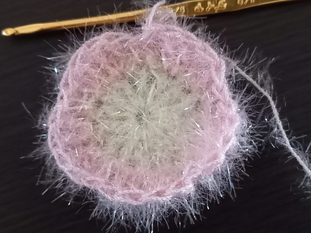 たわし用ヤーンのパステル色とキラキラした糸が相まって可愛い編みあがり。